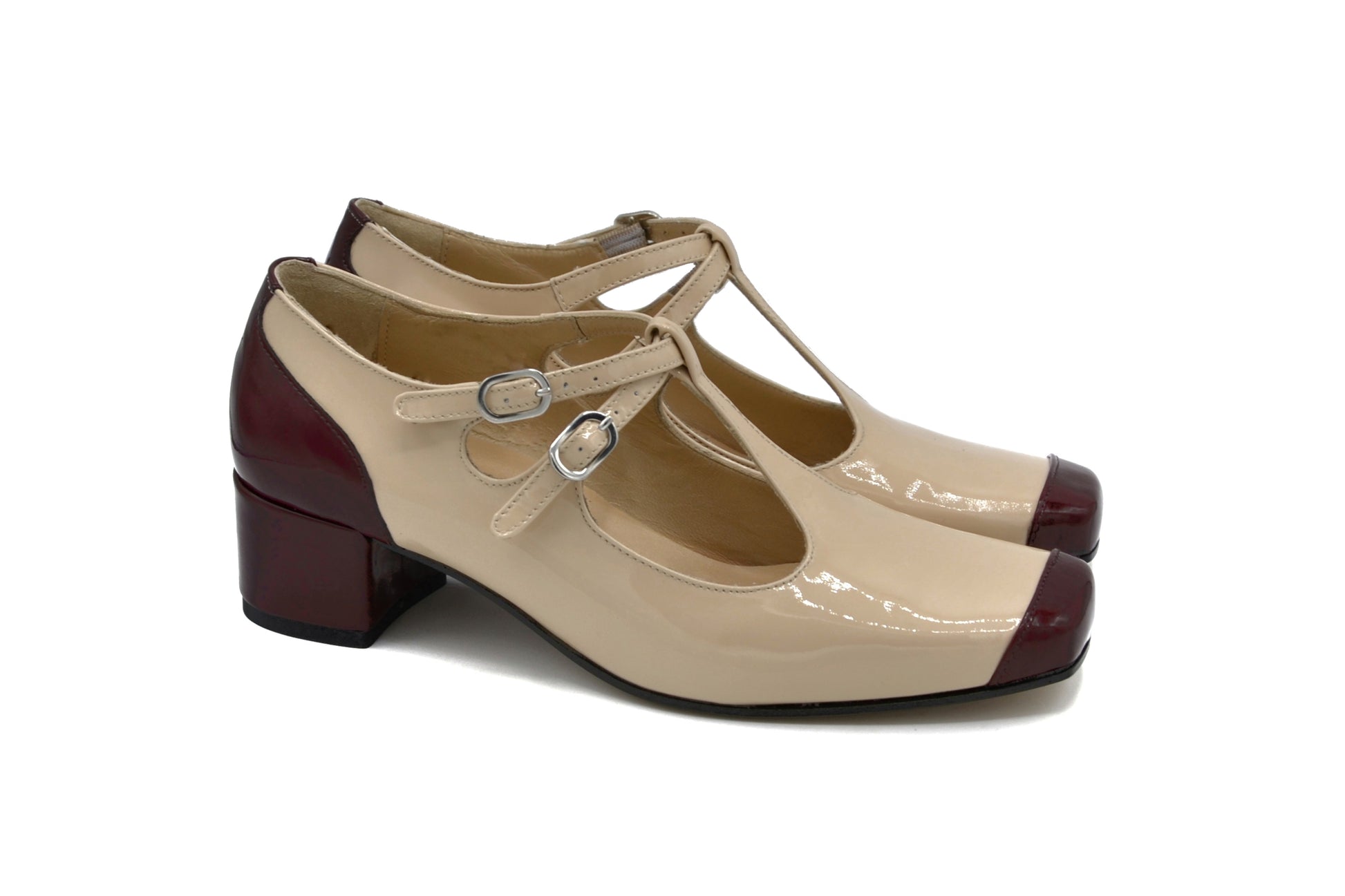 Le décolletés Amelia con doppio cinturino, realizzate in pelle in vernice.