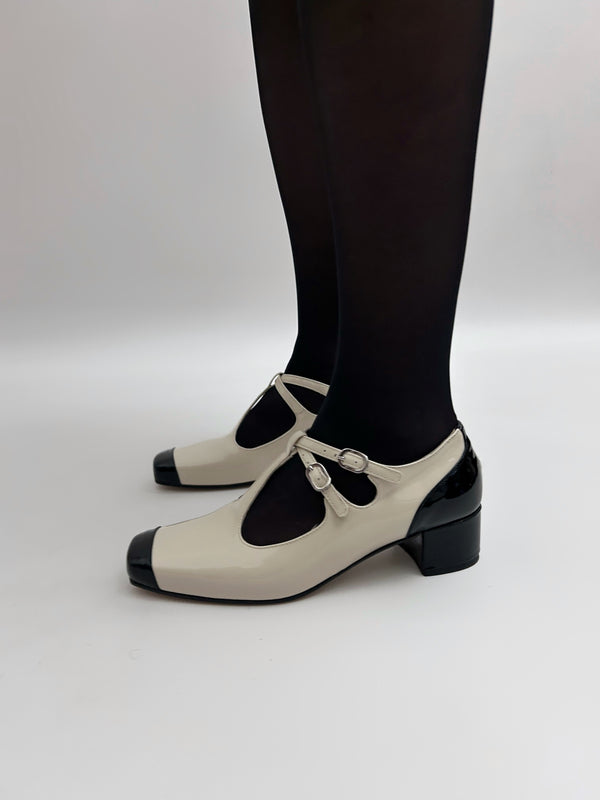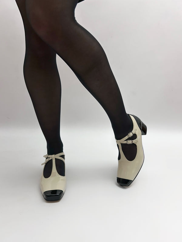 Le décolletés Amelia con doppio cinturino, realizzate in pelle in vernice.