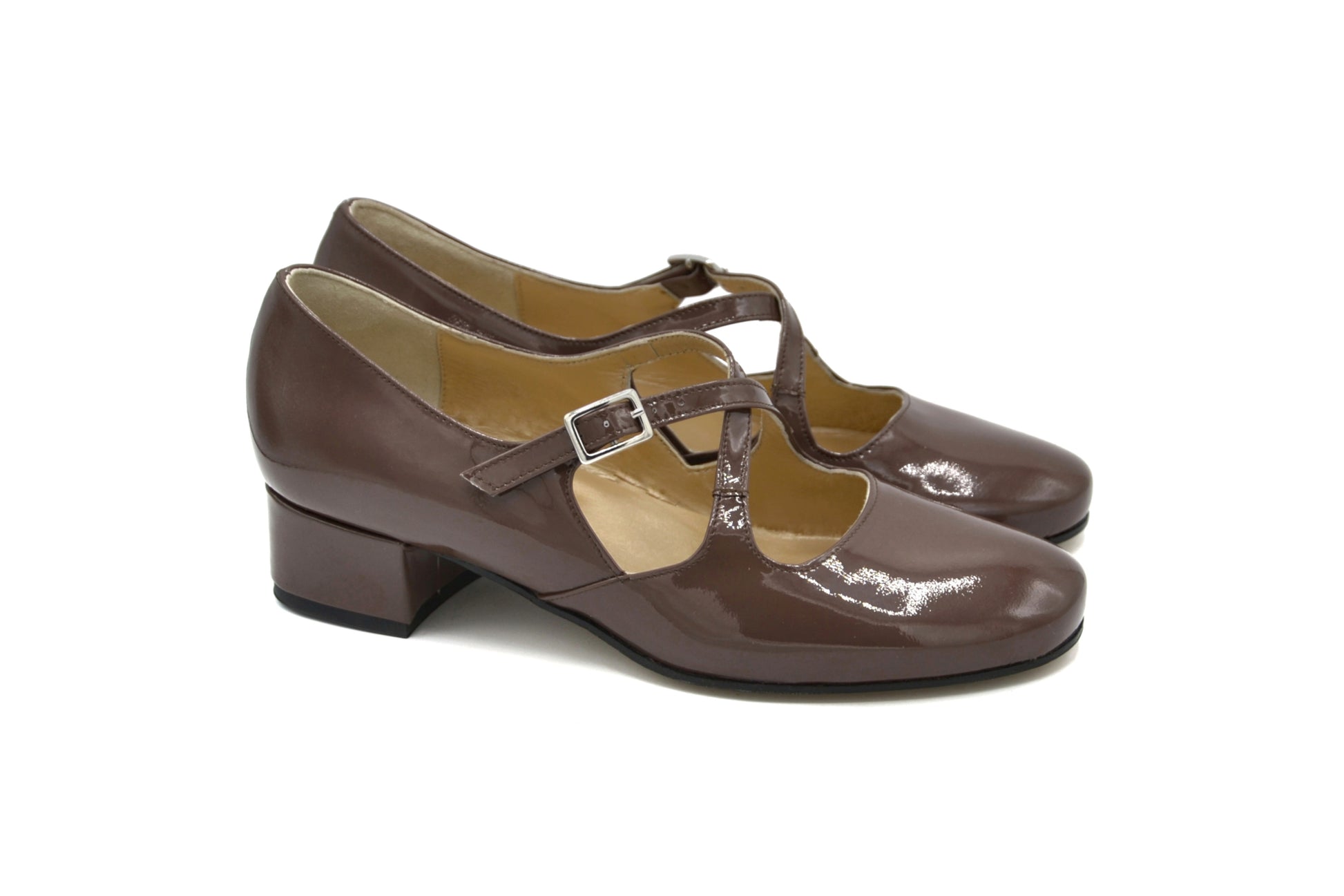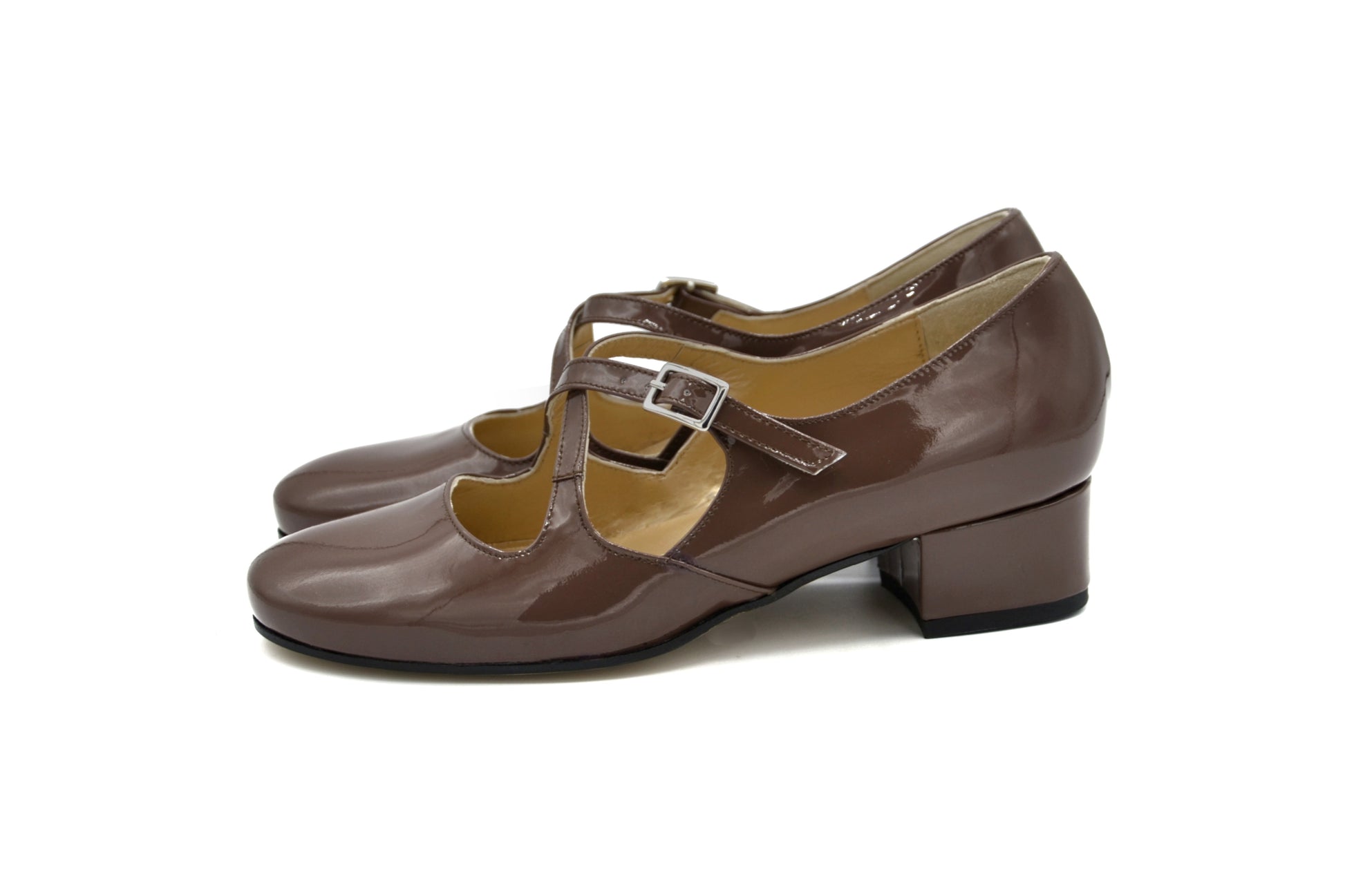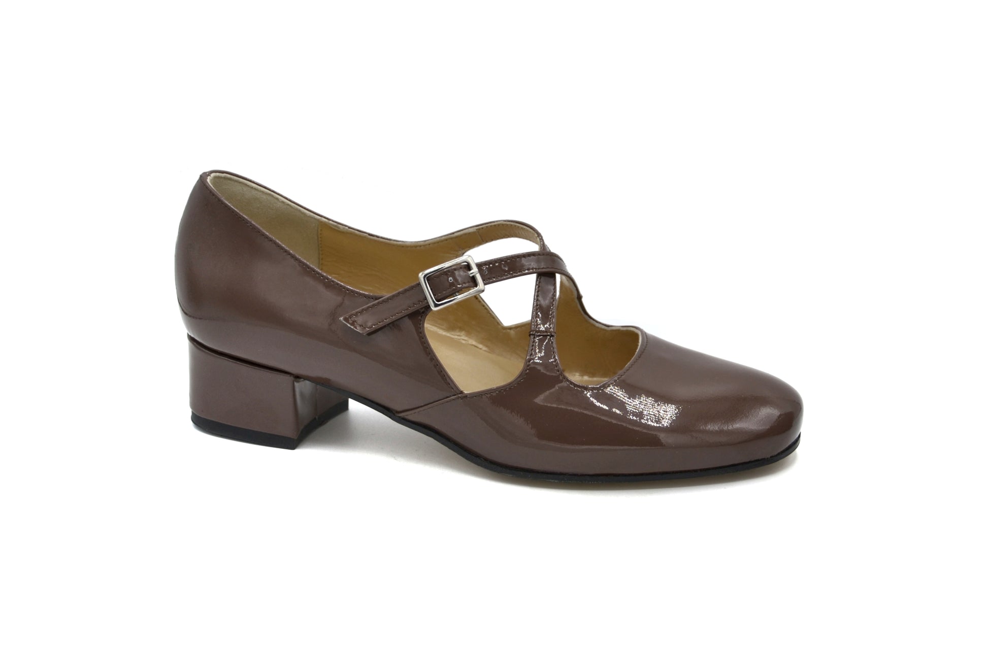 Le décolletés Iris realizzate in pelle in vernice con cinturino charleston.
