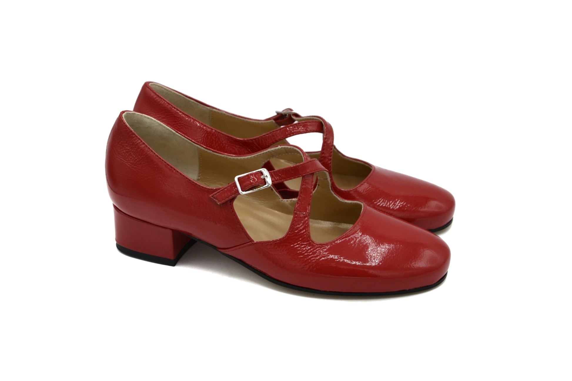 Le décolletés Iris realizzate in pelle in vernice con cinturino charleston.