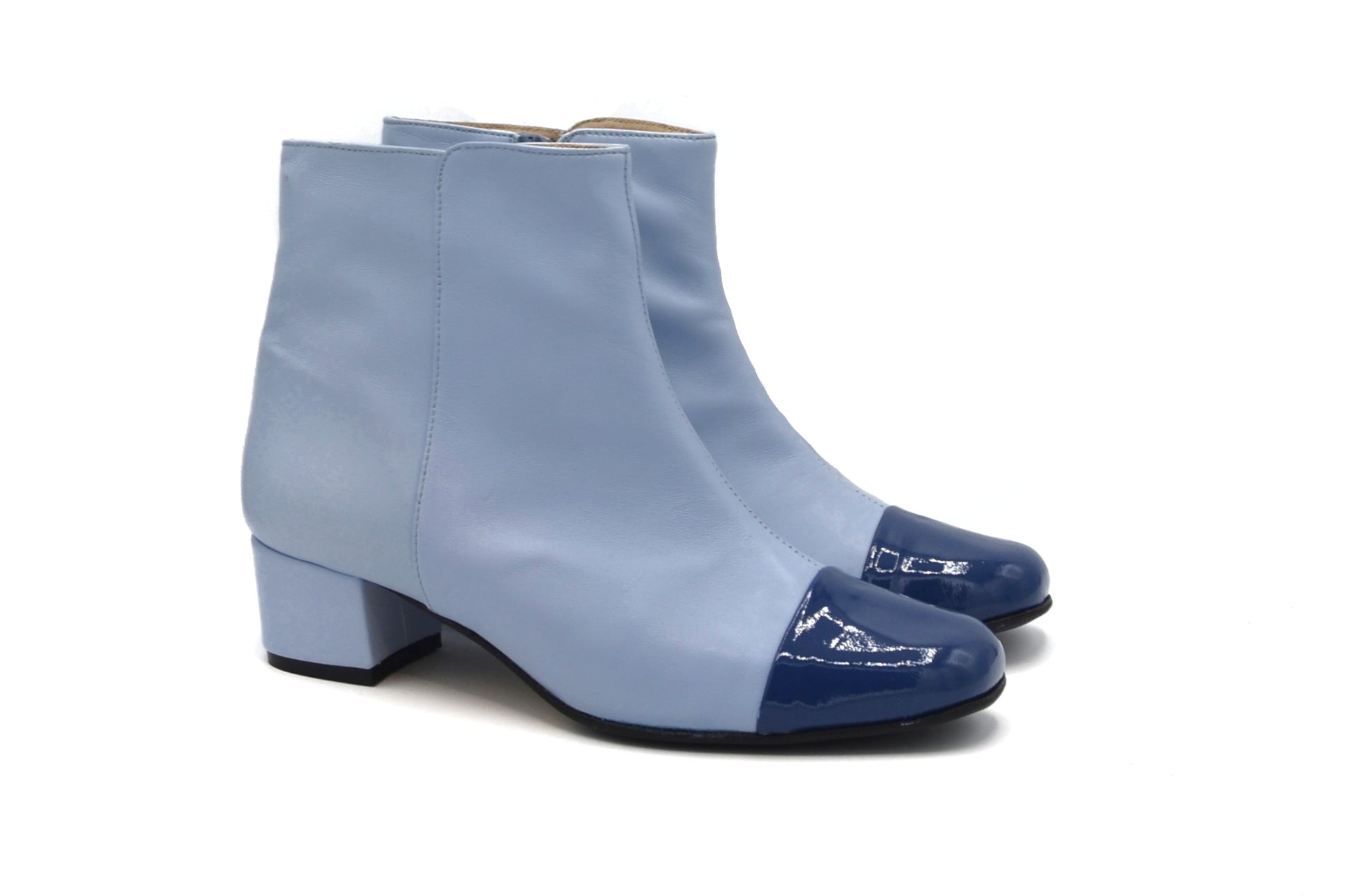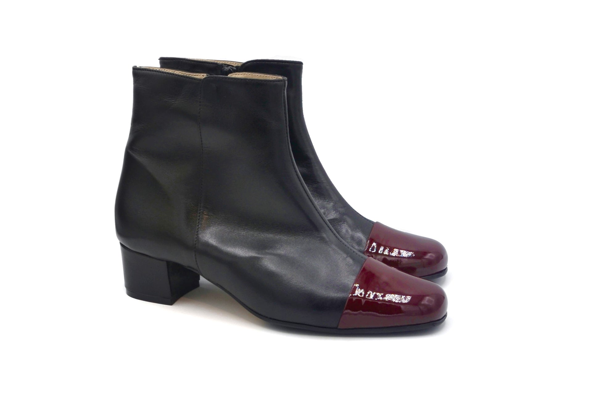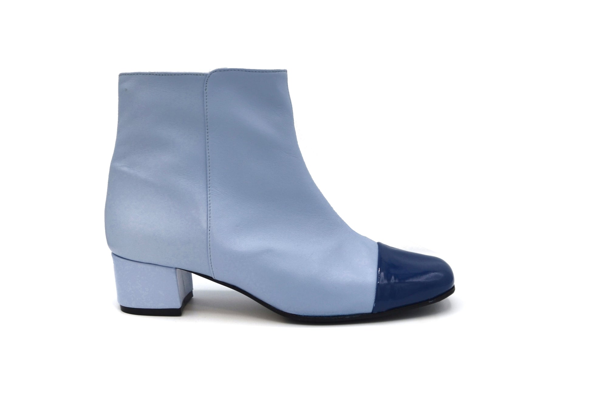 Gli stivaletti Laetitia realizzati in doppio materiale utilizzando una morbidissima nappa(pelle) ed una pelle in vernice per il puntale.