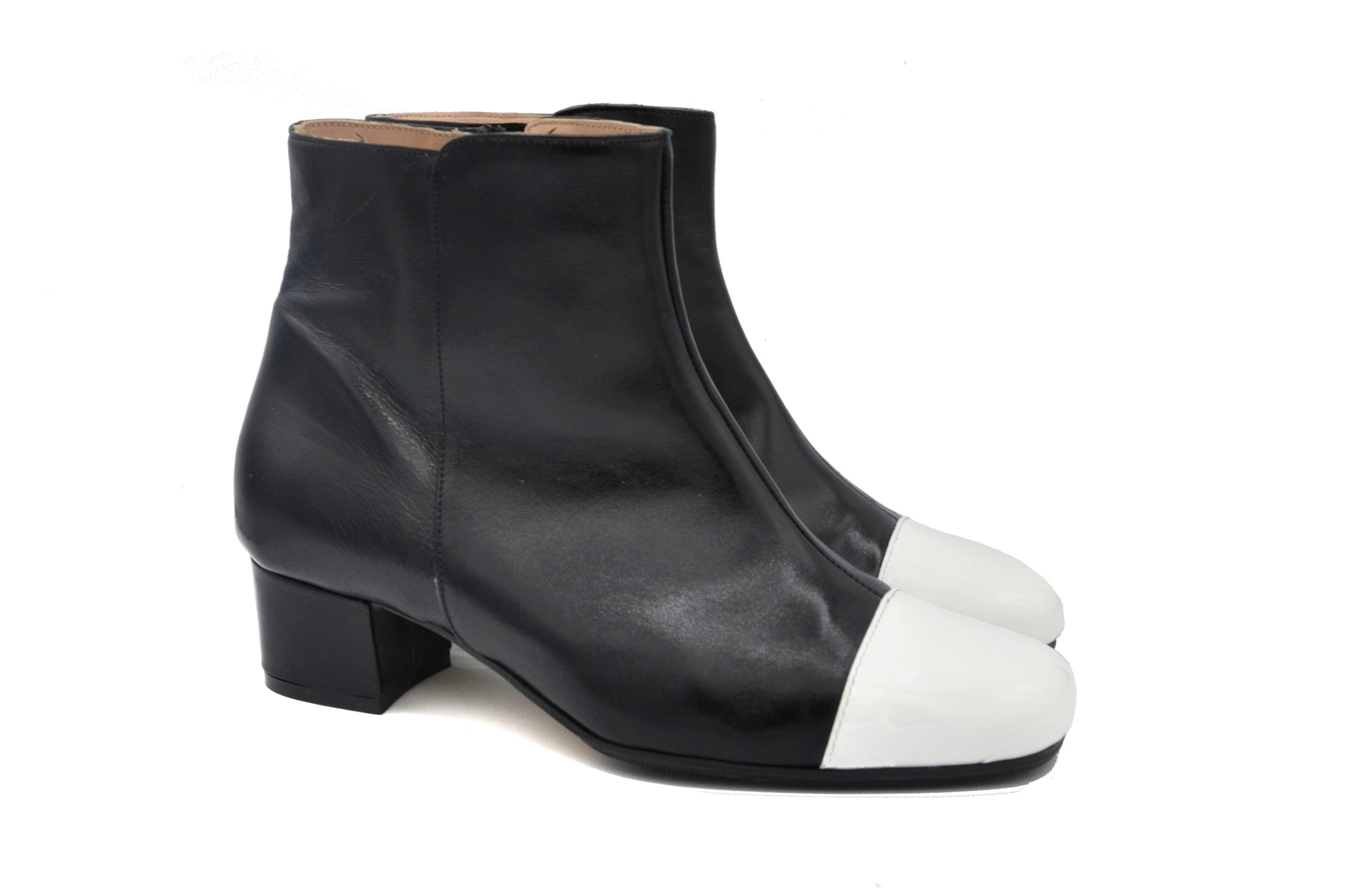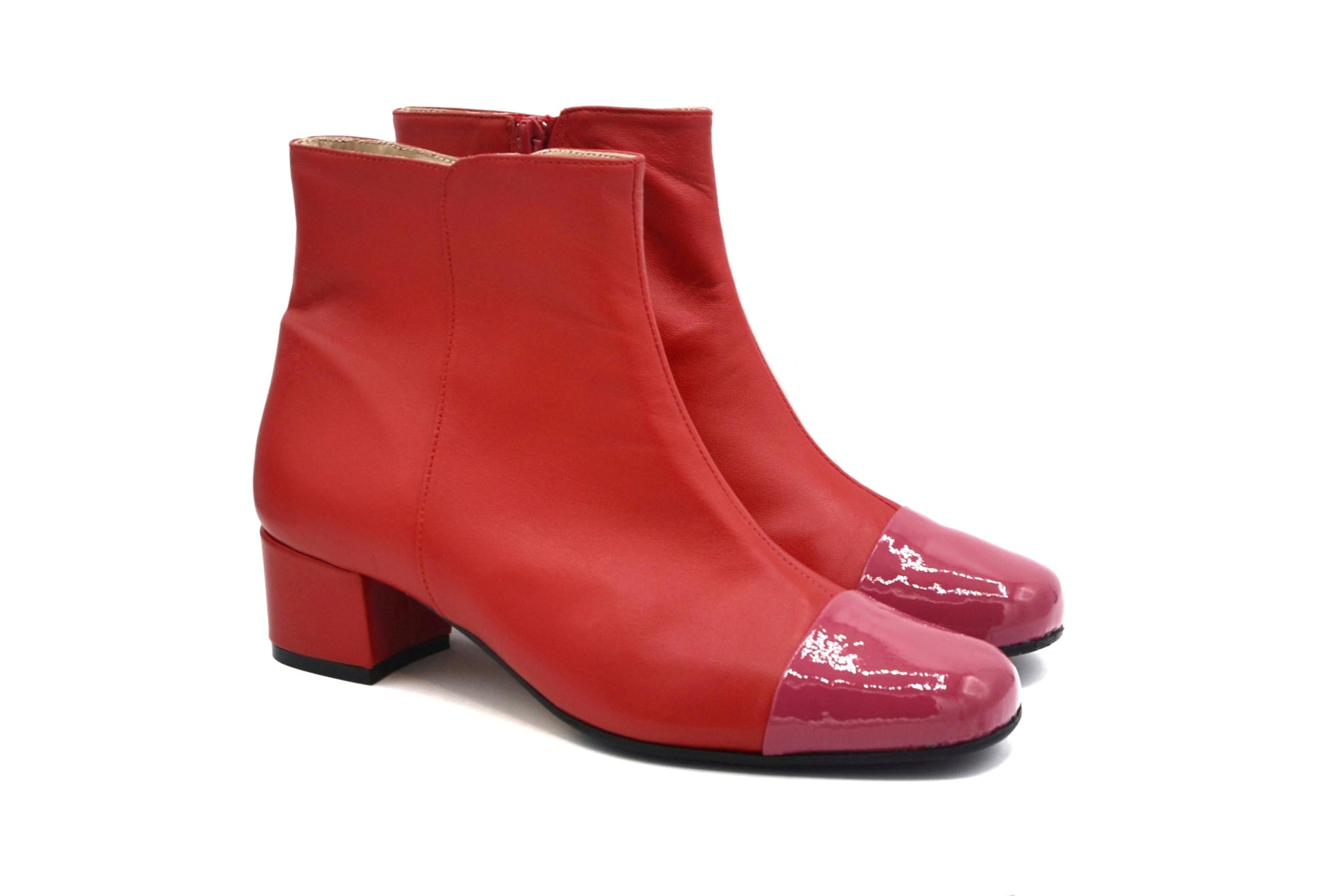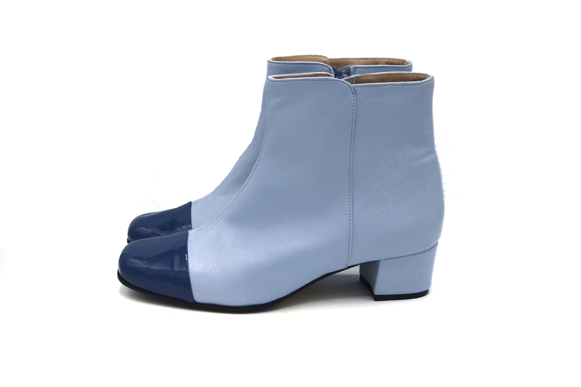 Gli stivaletti Laetitia realizzati in doppio materiale utilizzando una morbidissima nappa(pelle) ed una pelle in vernice per il puntale.