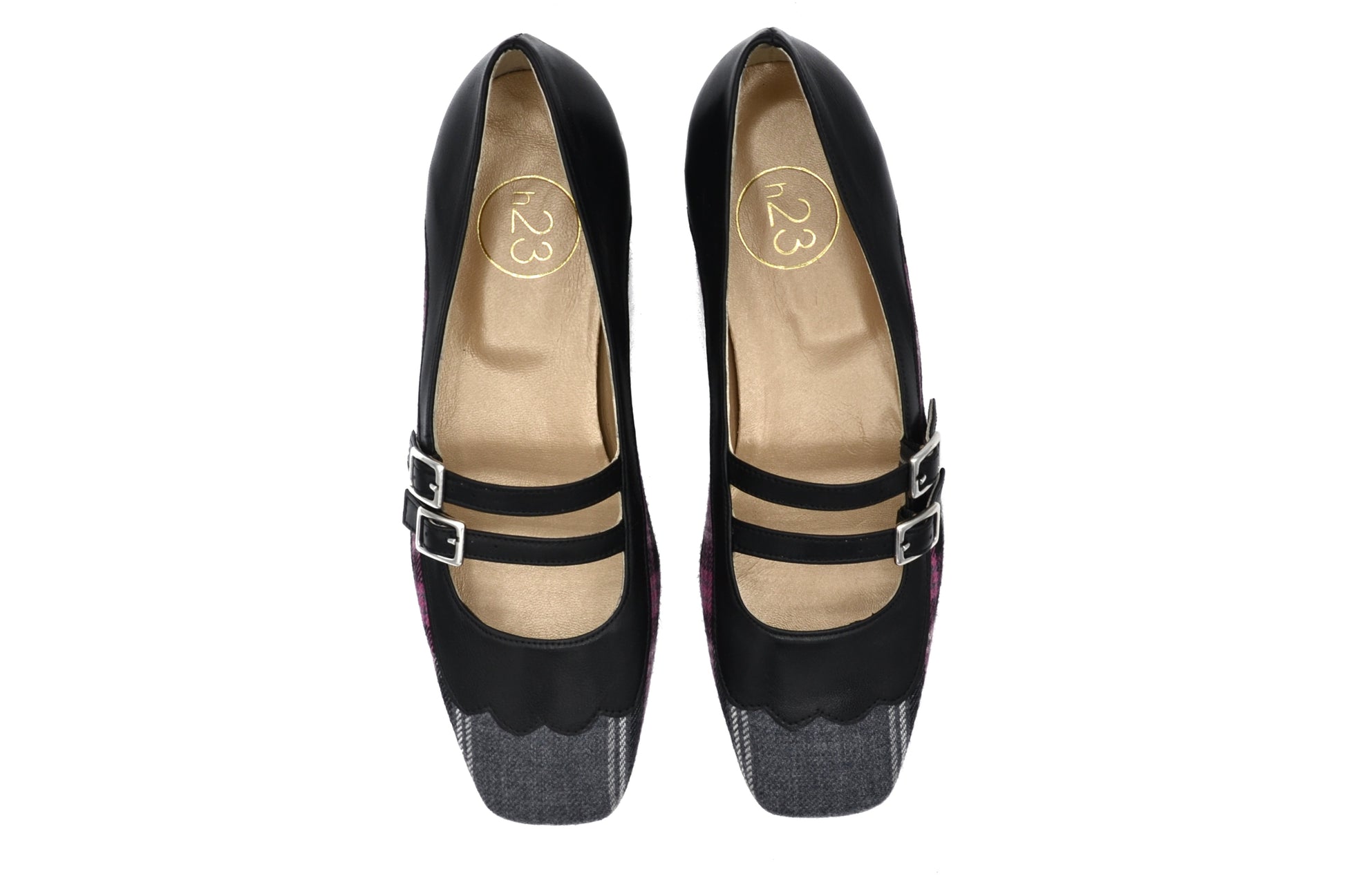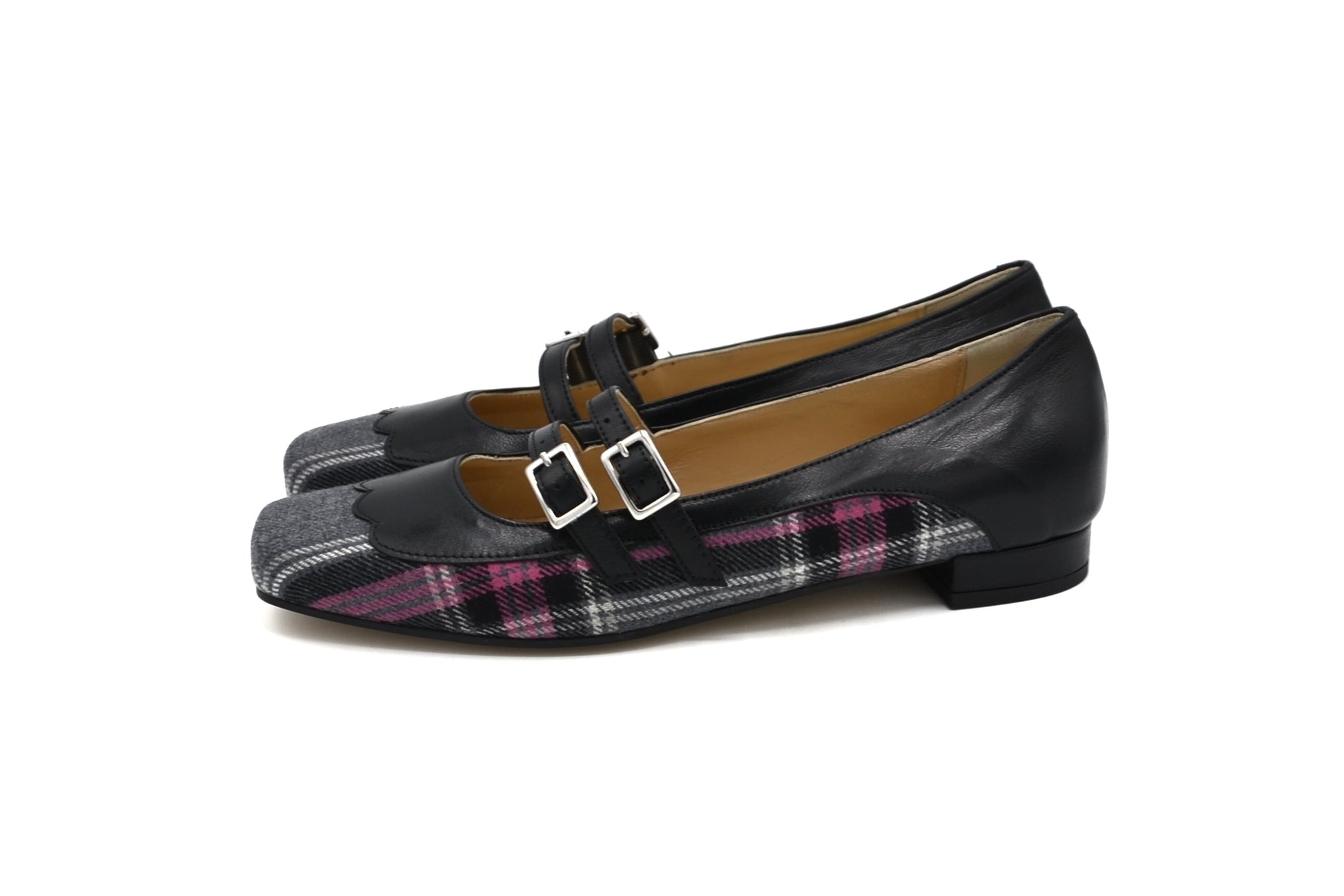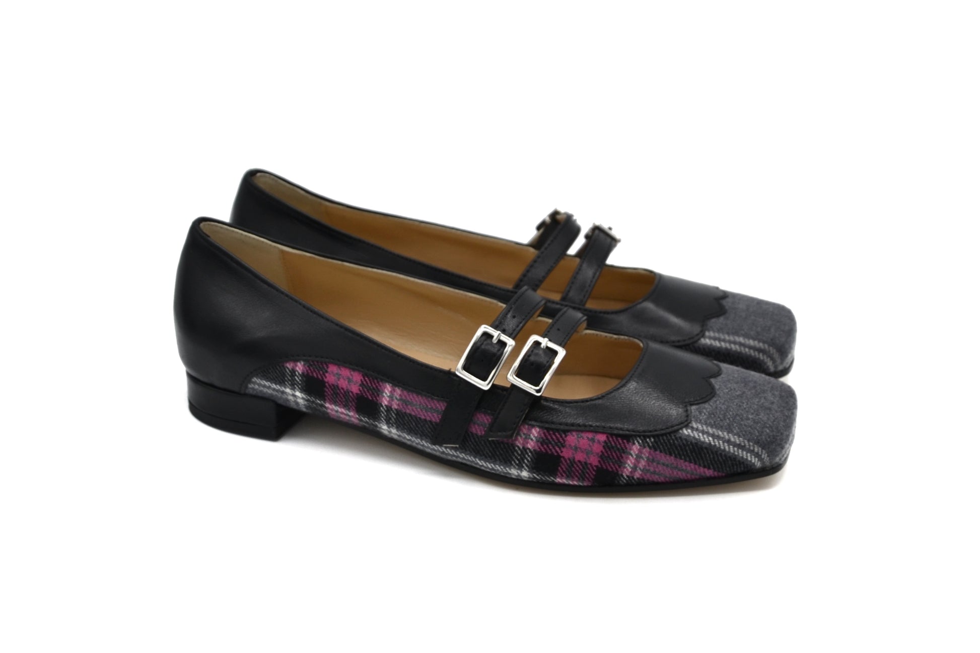 Le décolletés Margherita realizzate in pelle con petali e riporto in tessuto tartan.