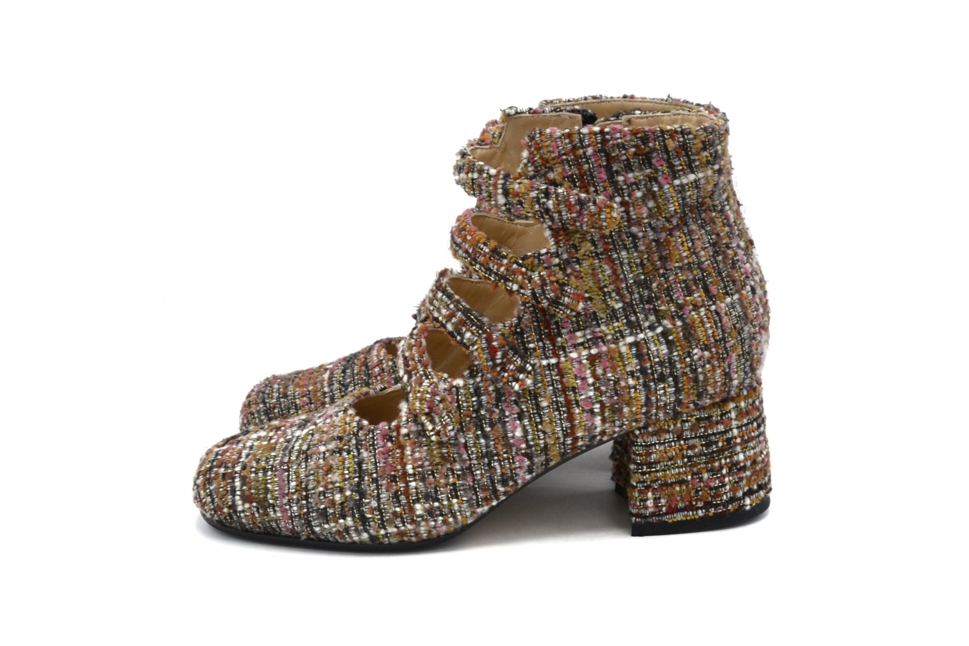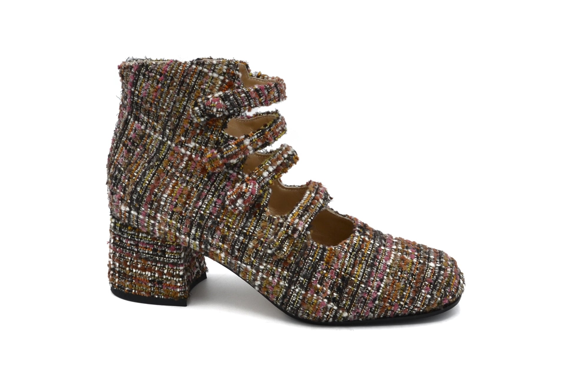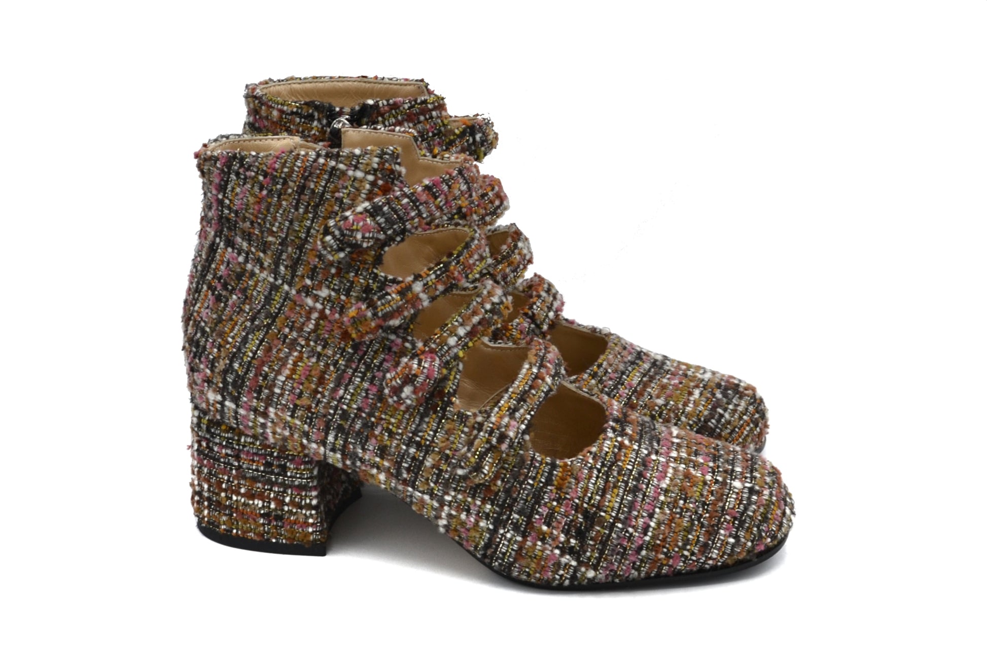 Gli stivaletti Marta realizzati in tessuto bouclè.