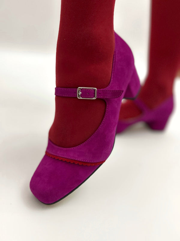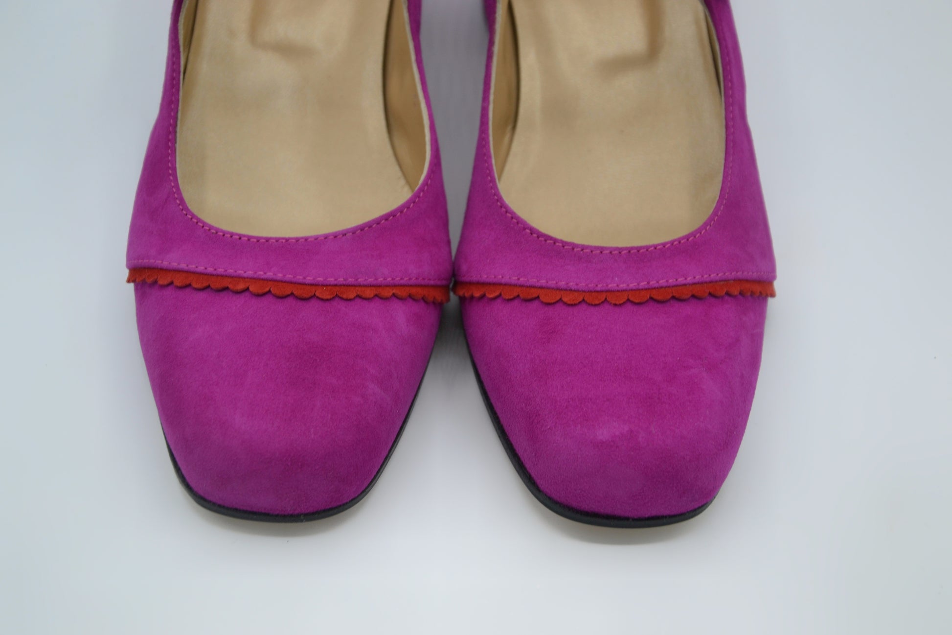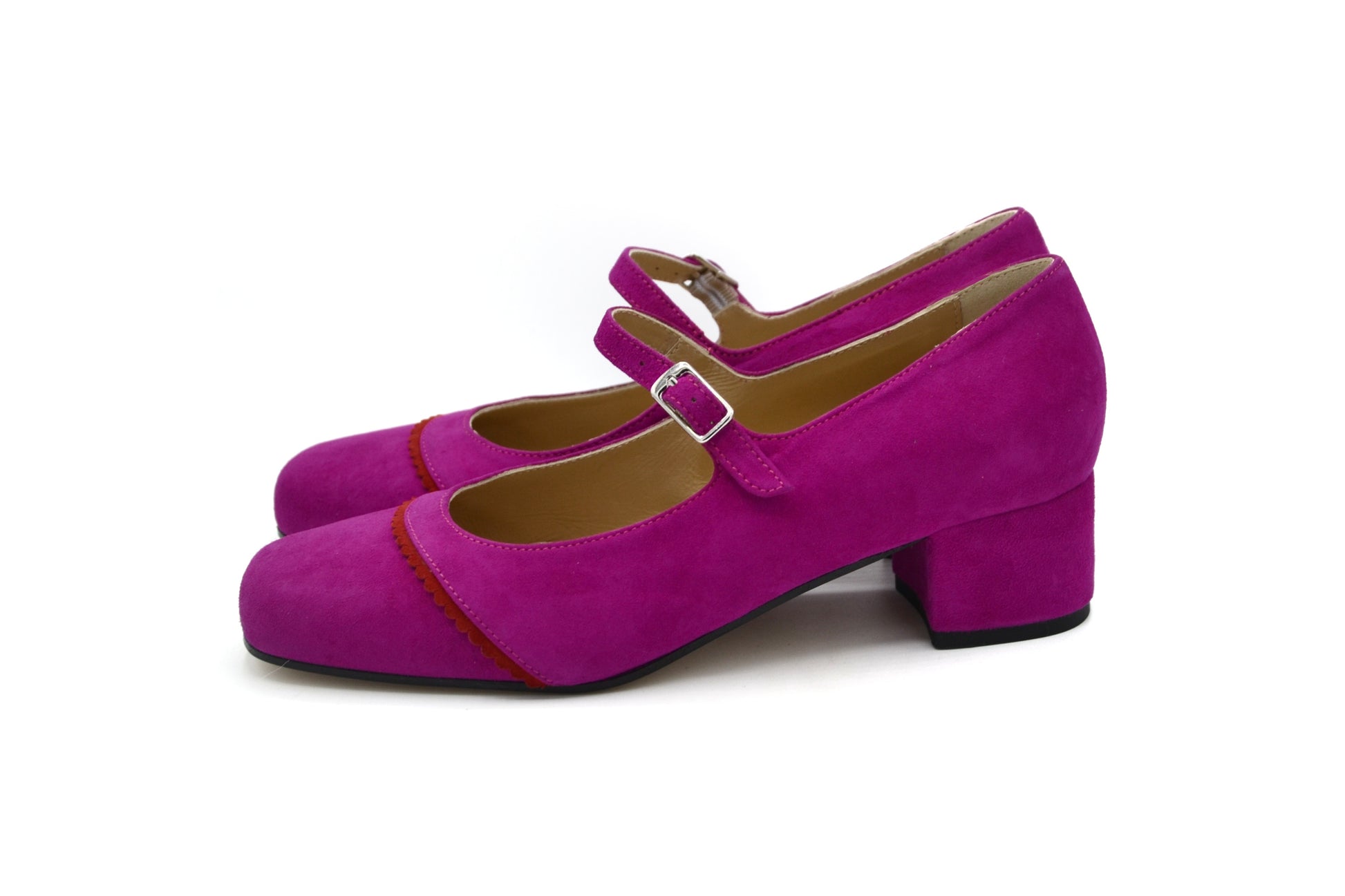 Le décolletés Melissa realizzate in pelle scamosciata con merletto in pelle in vernice e cinturino charleston.