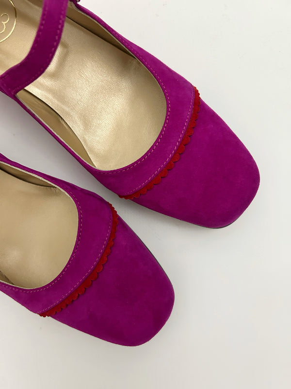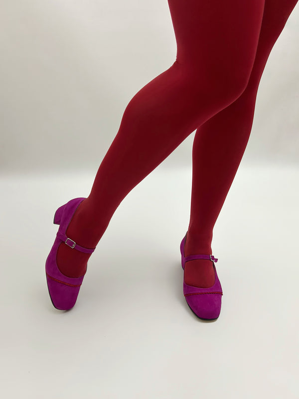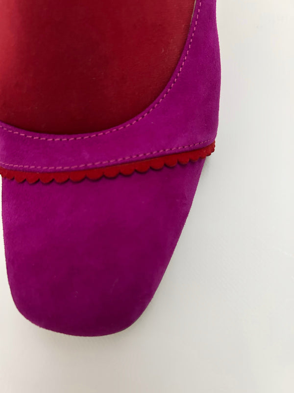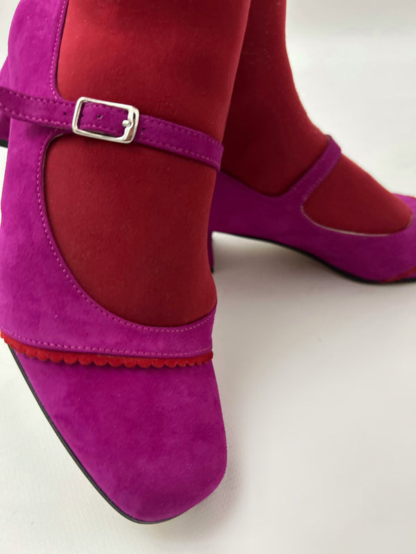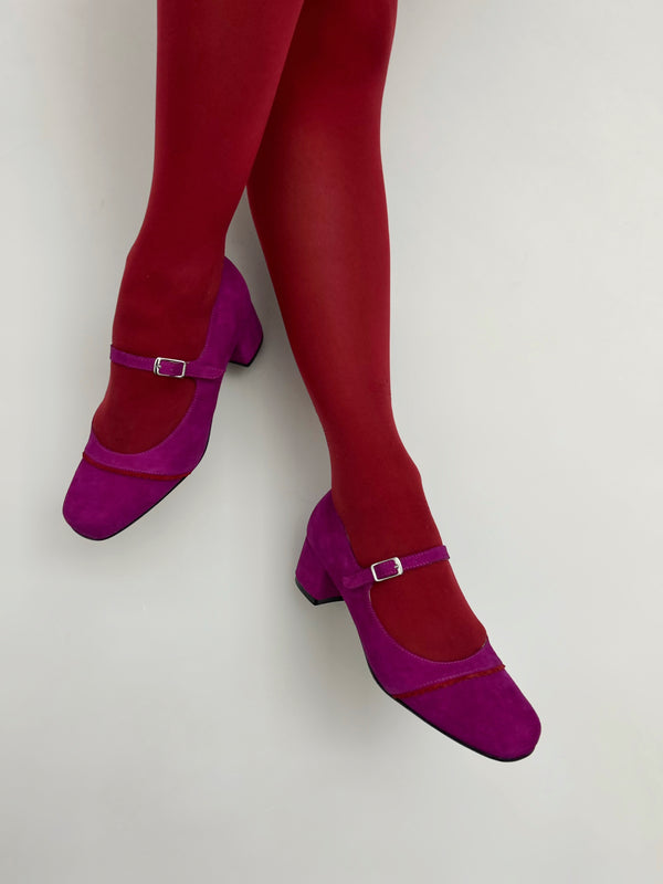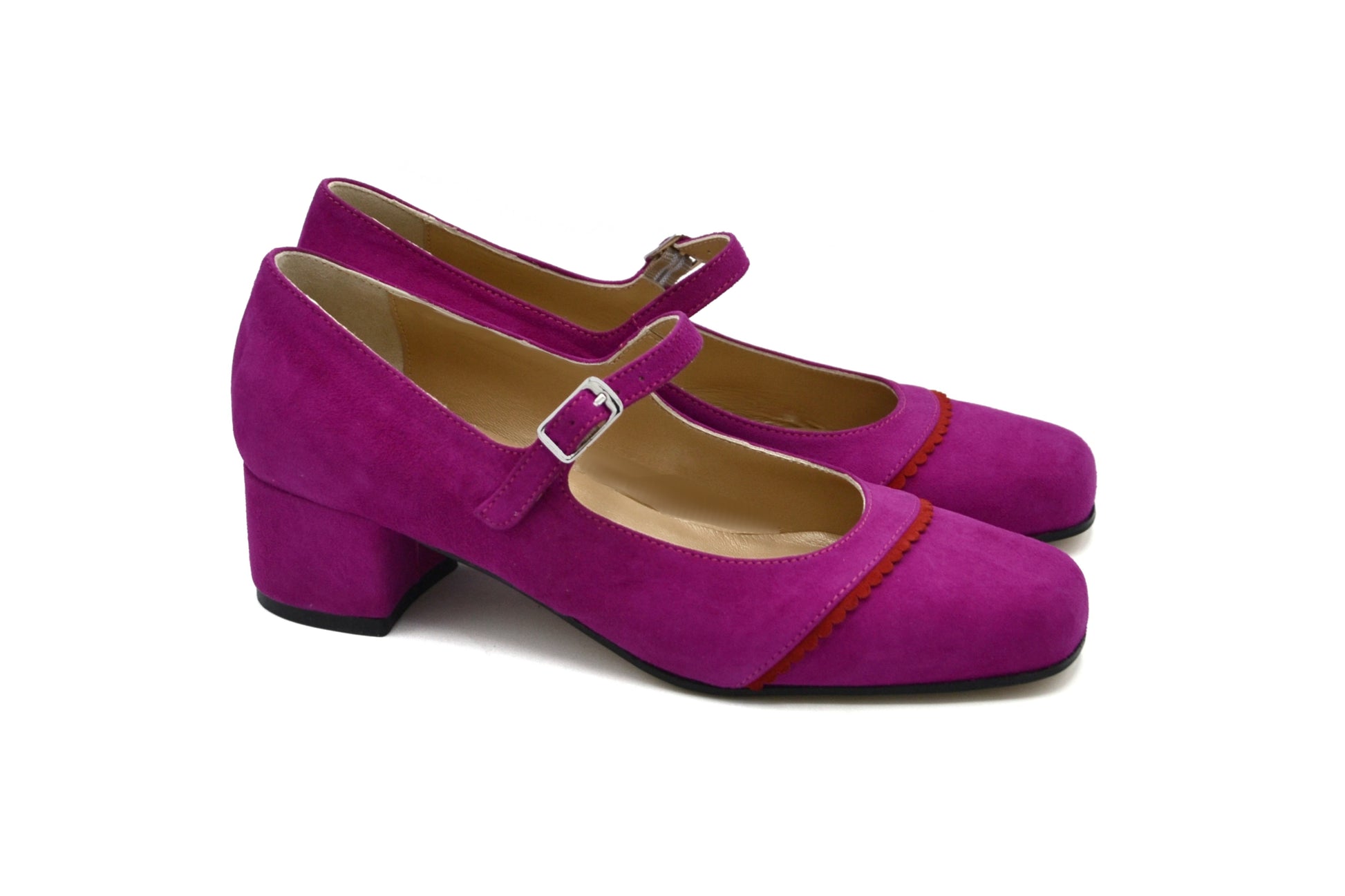 Le décolletés Melissa realizzate in pelle scamosciata con merletto in pelle in vernice e cinturino charleston.