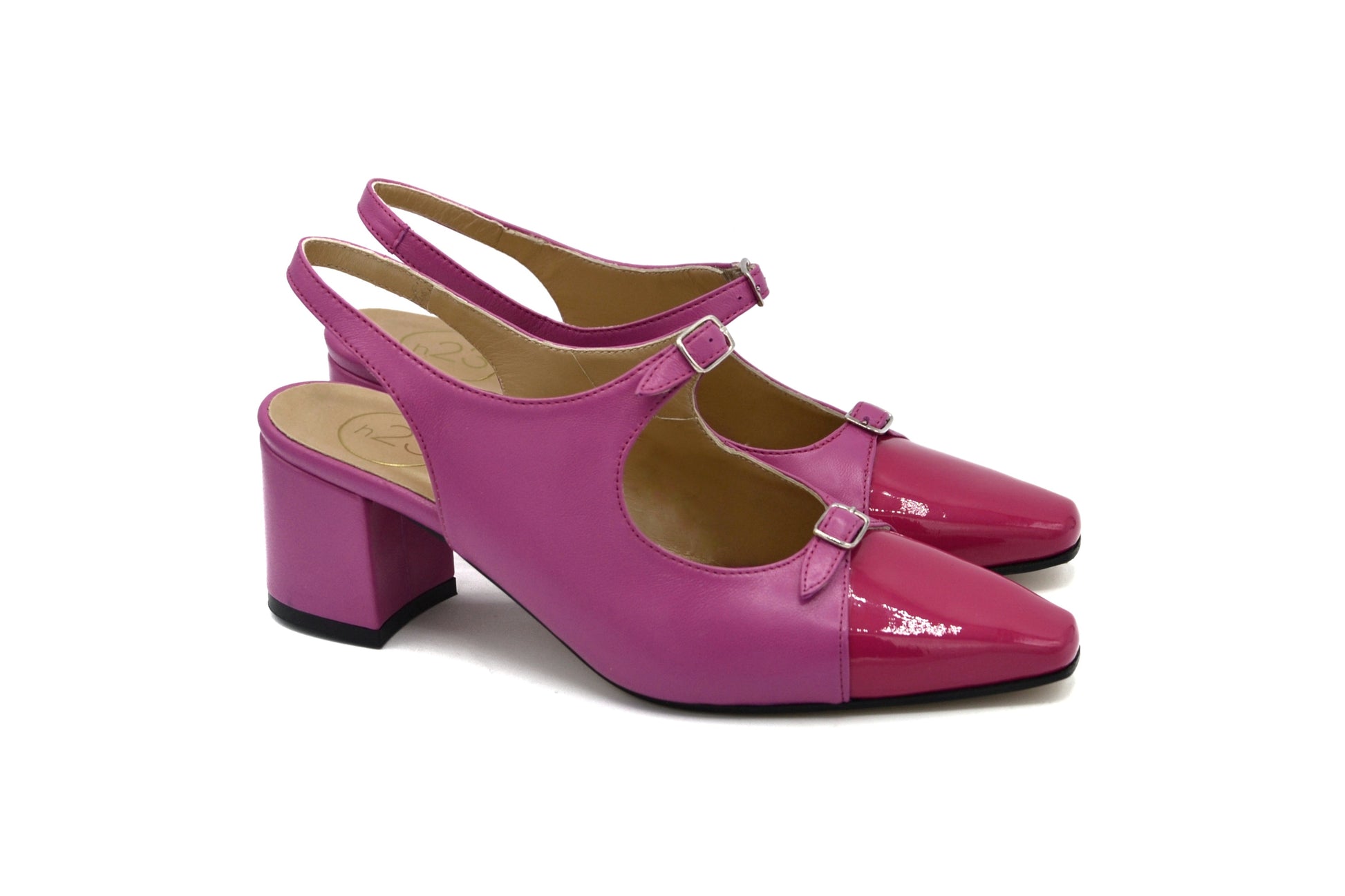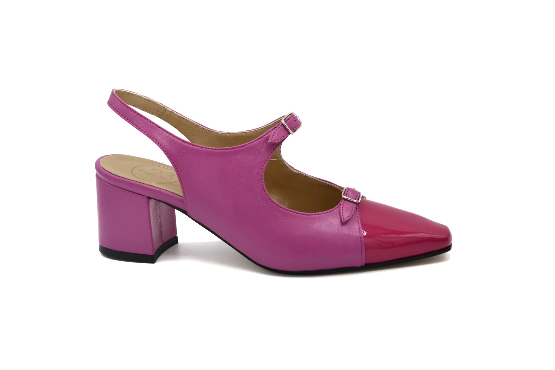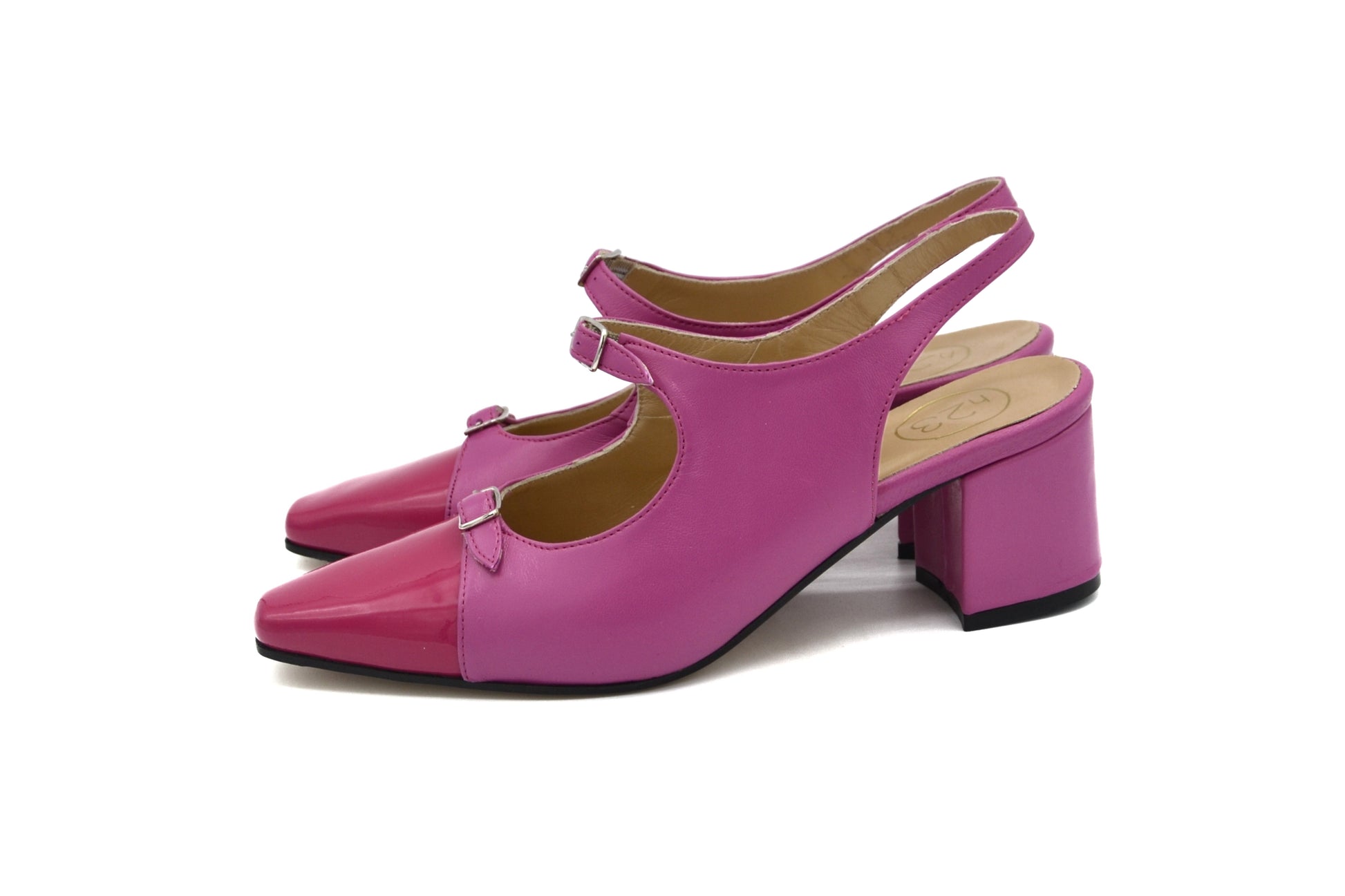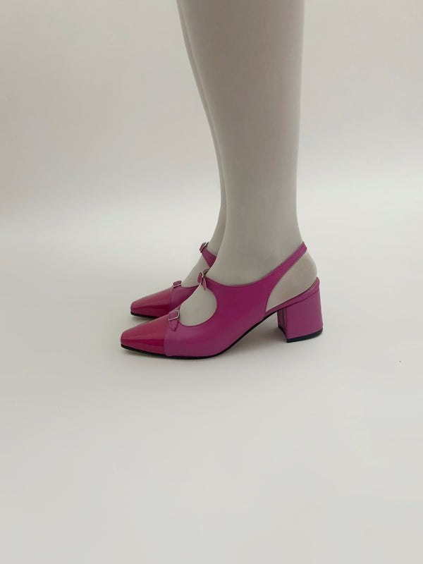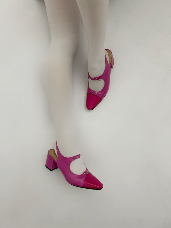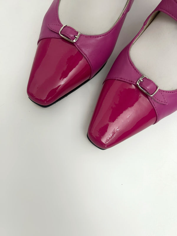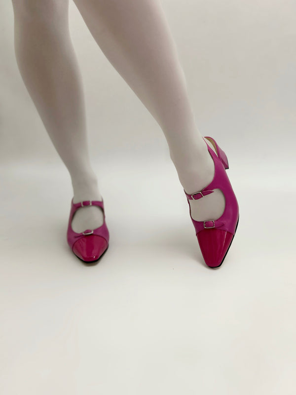 Le décolletés slingback Petra realizzate in pelle in vernice con doppio cinturino charleston e puntale in pelle in vernice.