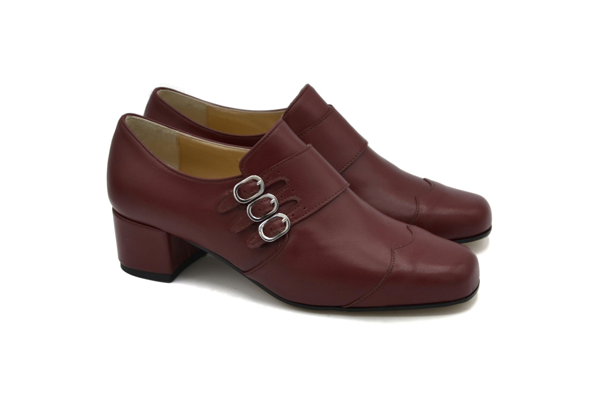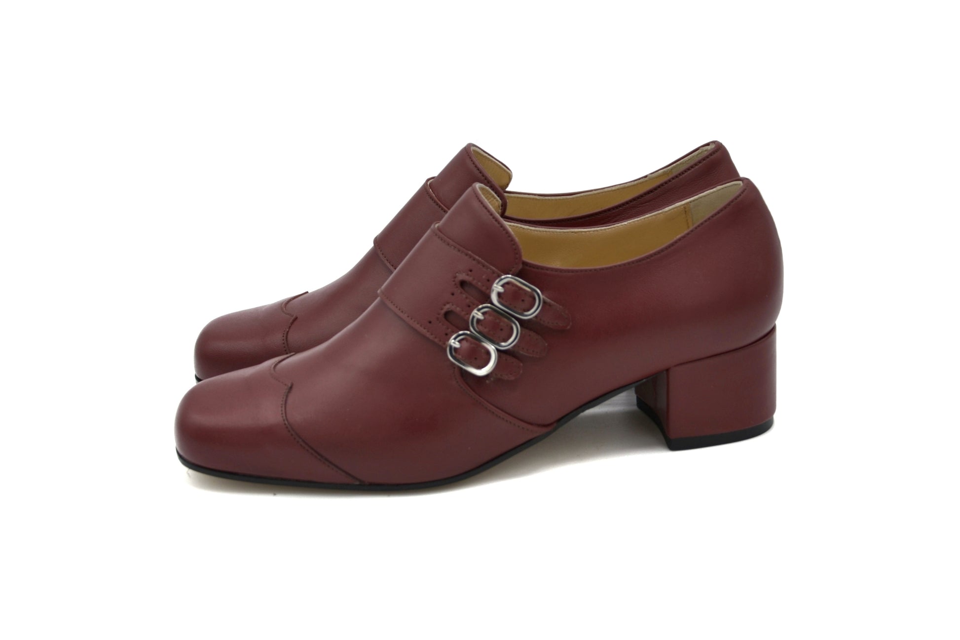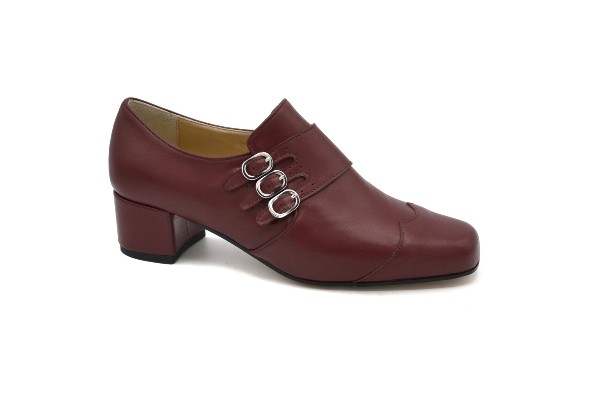 La derby Astrid con triplo cinturino, realizzate pelle in vernice.