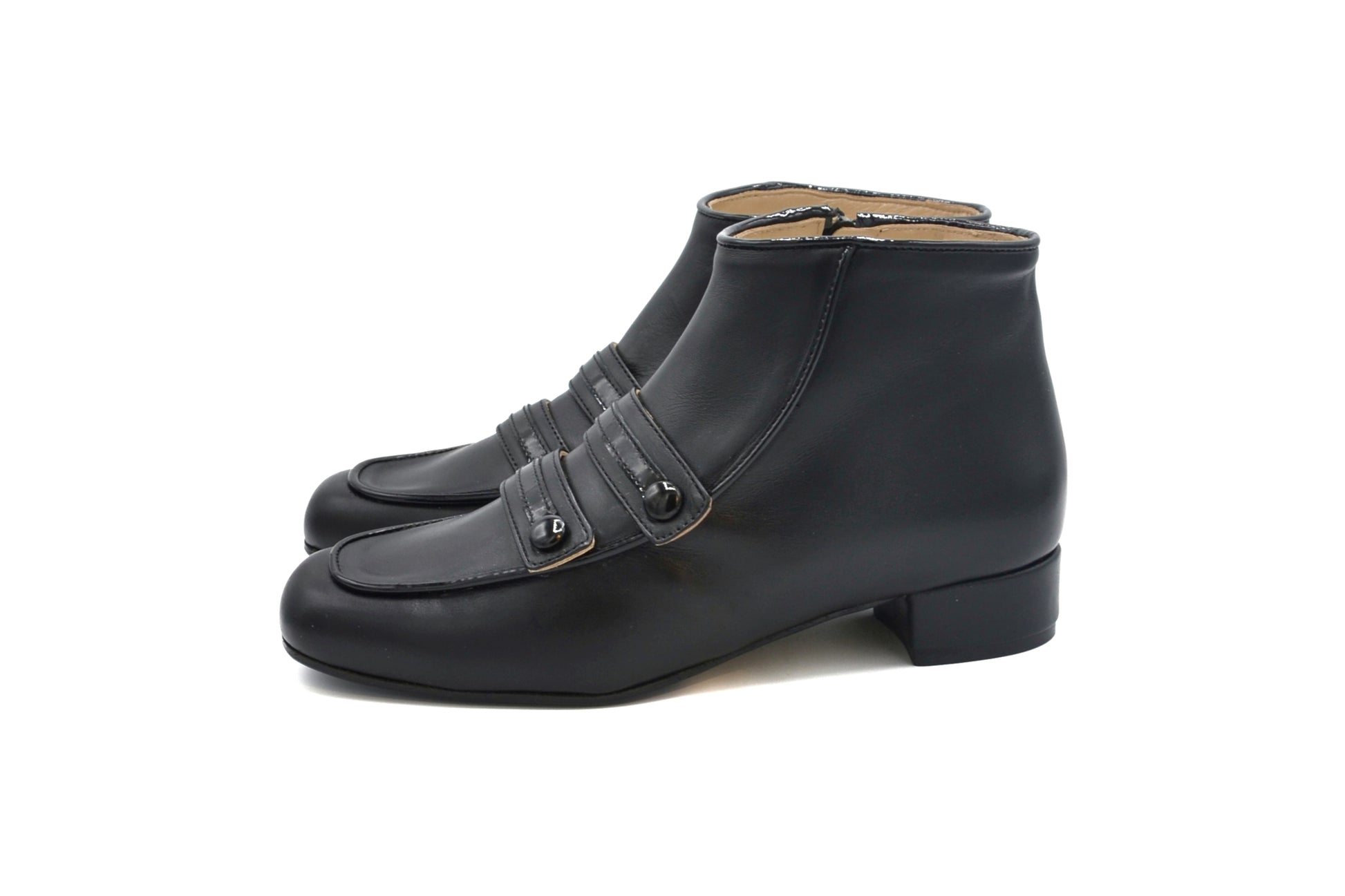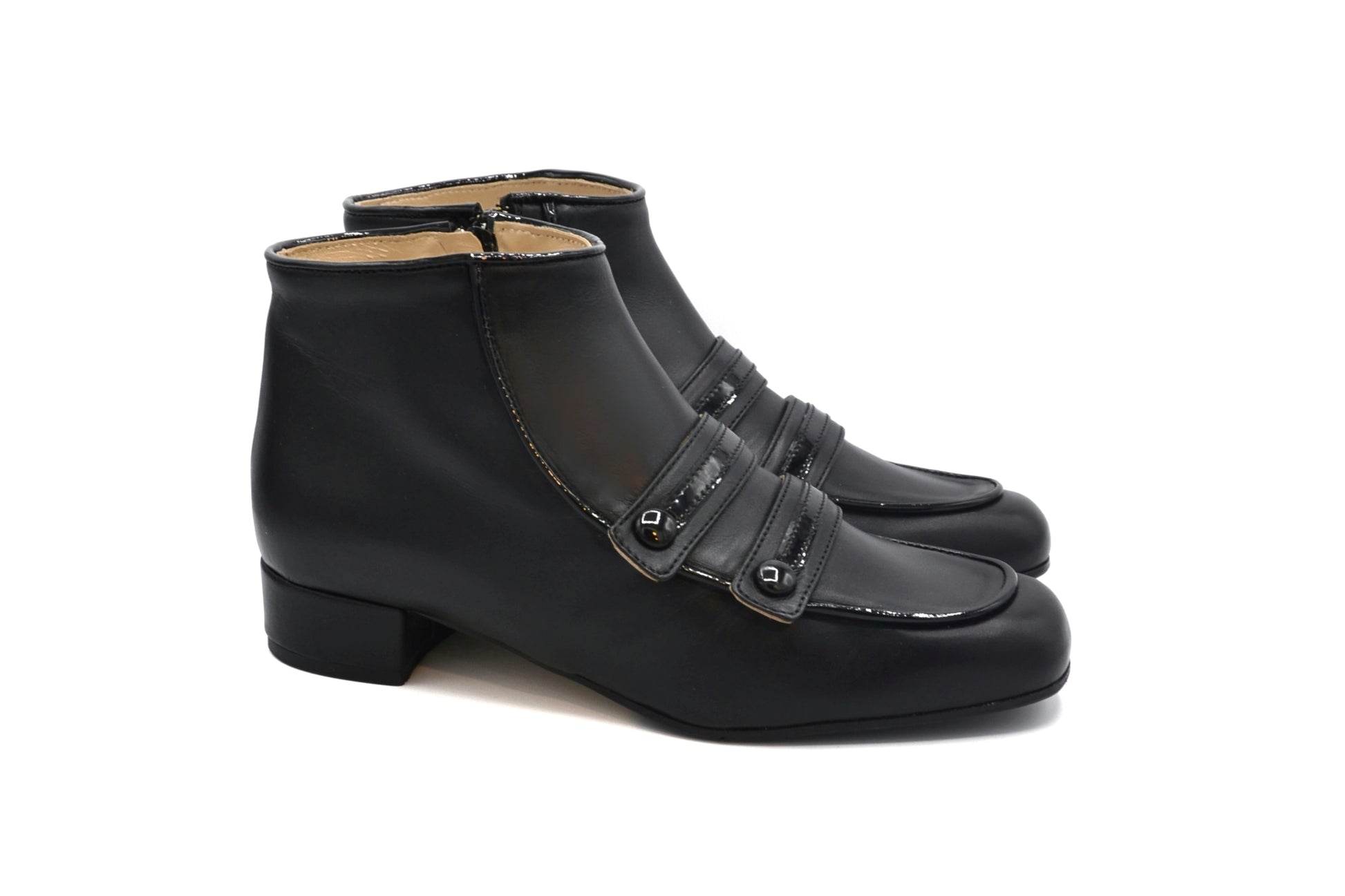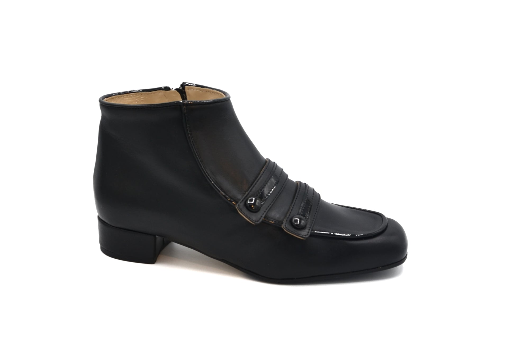 Upper: leather with patent leather inserts and buttons.