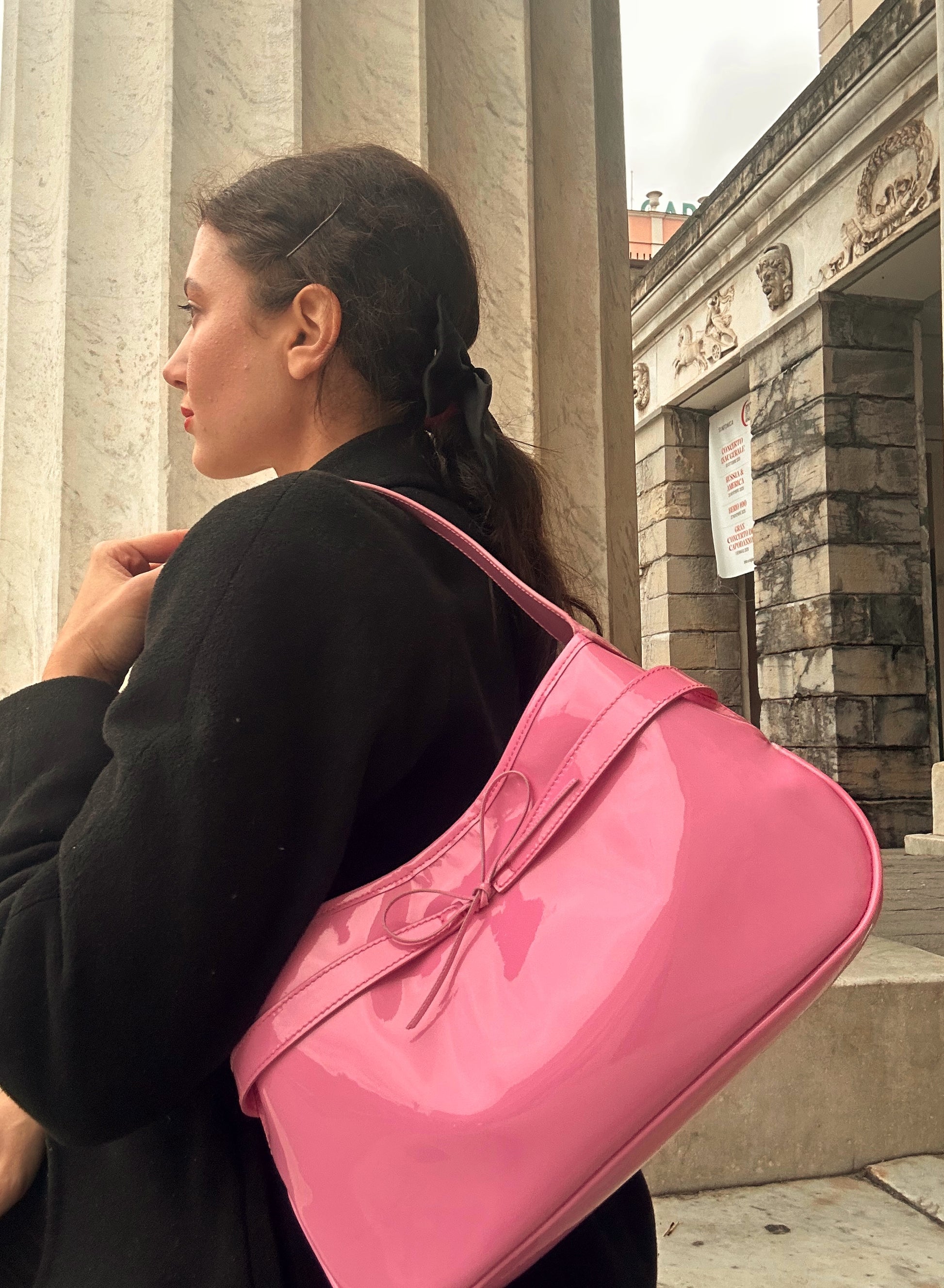 Ines, la nostra nuova borsa a mezzaluna dalla silhouette arrotondata, morbida ma con una linea elegante e pulita una misura perfetta, capace di contenere tutto ciò che vi è prezioso, restando leggera, armoniosa, sempre discreta. La sua ampia luce permette di indossarla con naturalezza , anche avvolte in un cappotto nelle mattine d’inverno. La chiusura a bottone è semplice, essenziale E poi c’è lui… il fiocco, la firma inconfondibile di Ines.