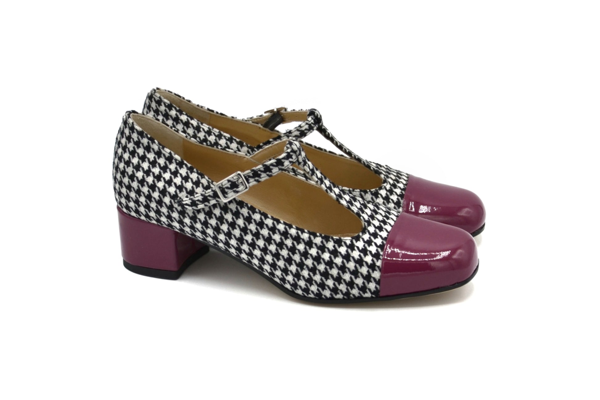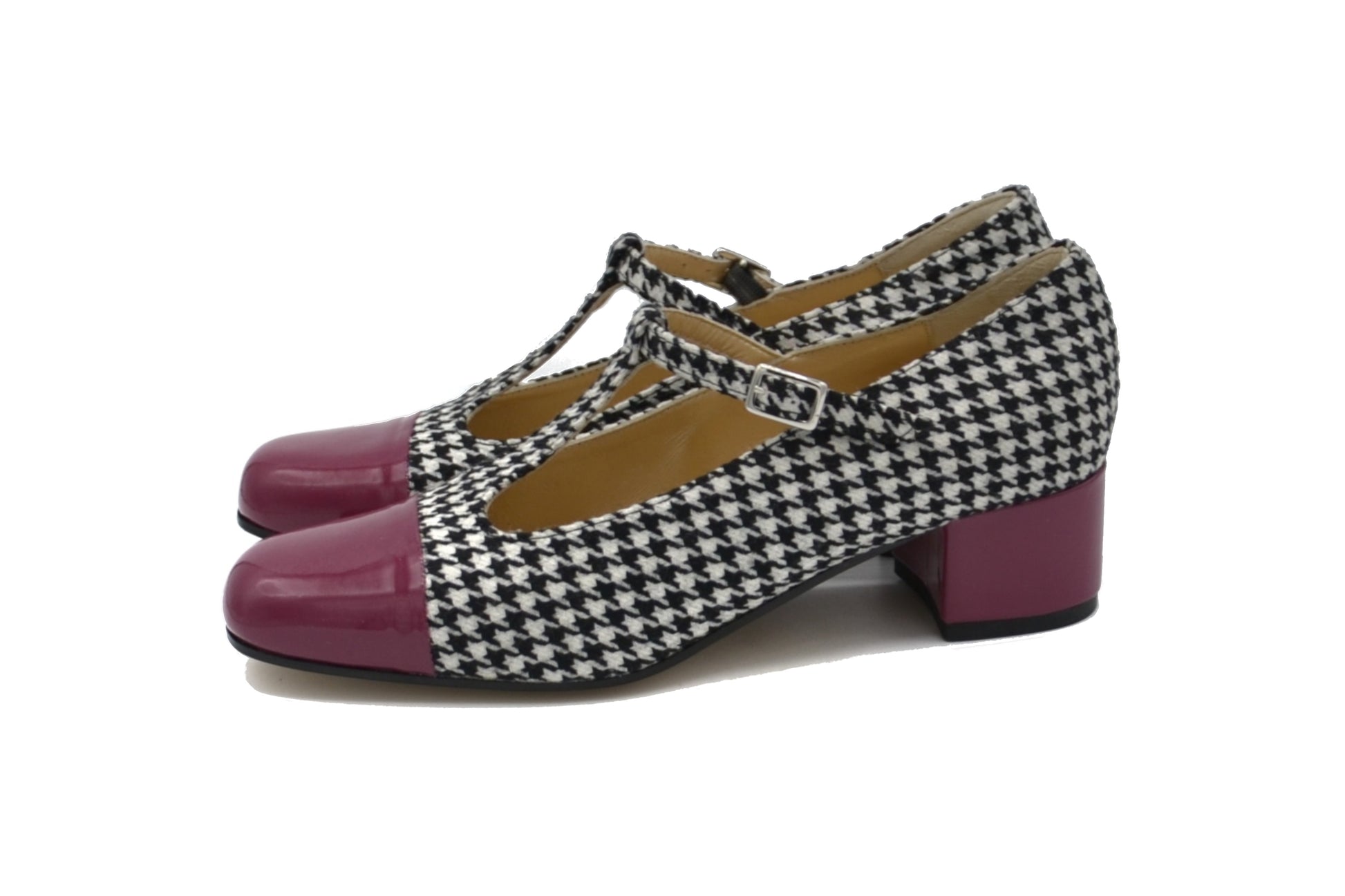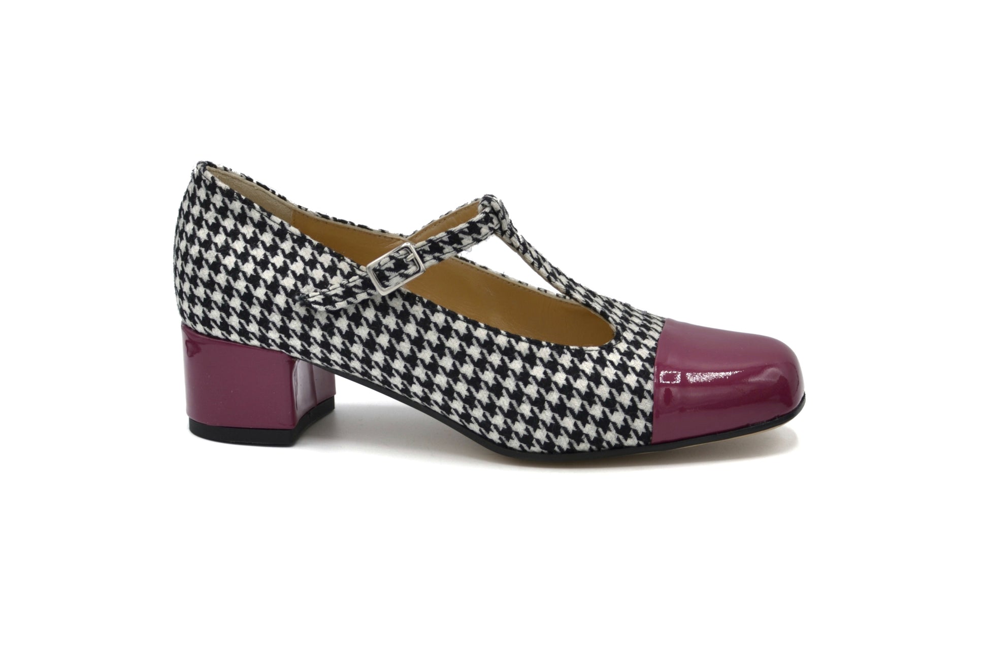 Le décolletés Ottavia realizzate in tessuto pied de poule con puntale in pelle in vernice cinturino charleston.