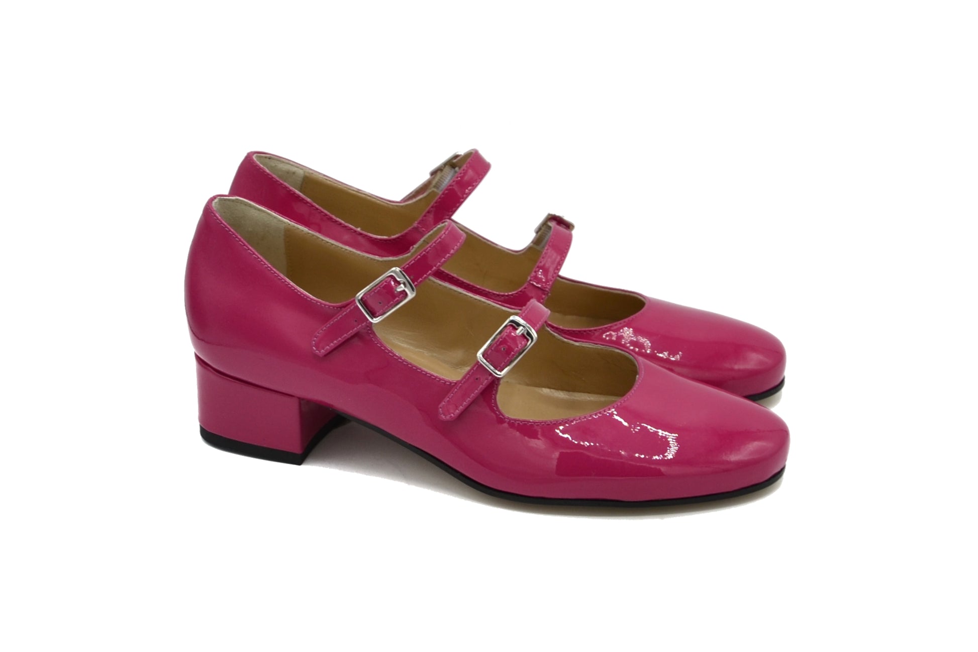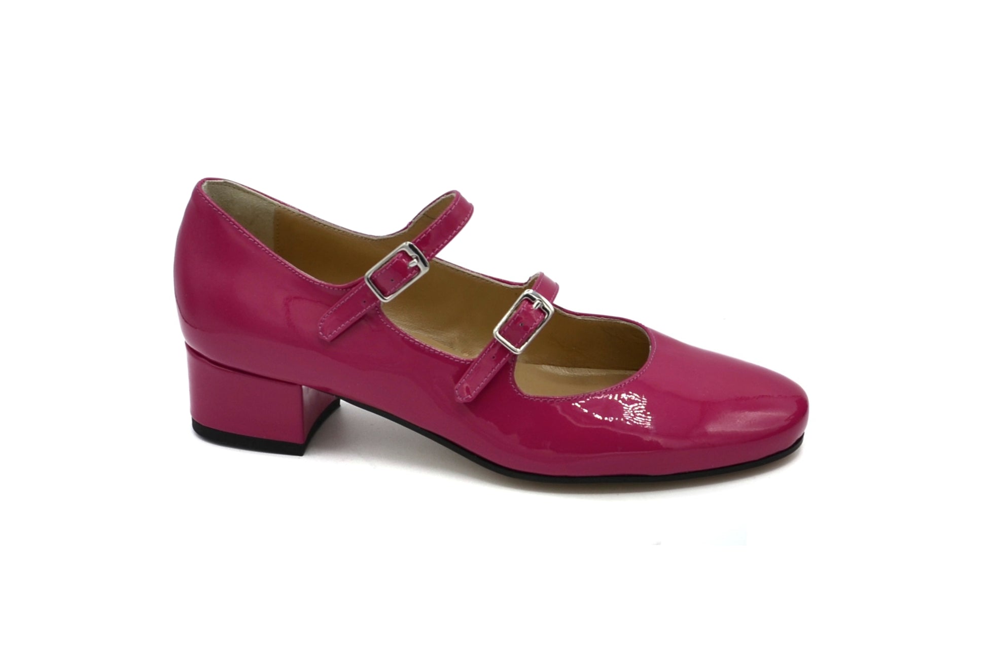 Le décolletés Viola realizzate in pelle in vernice con doppio cinturino charleston.